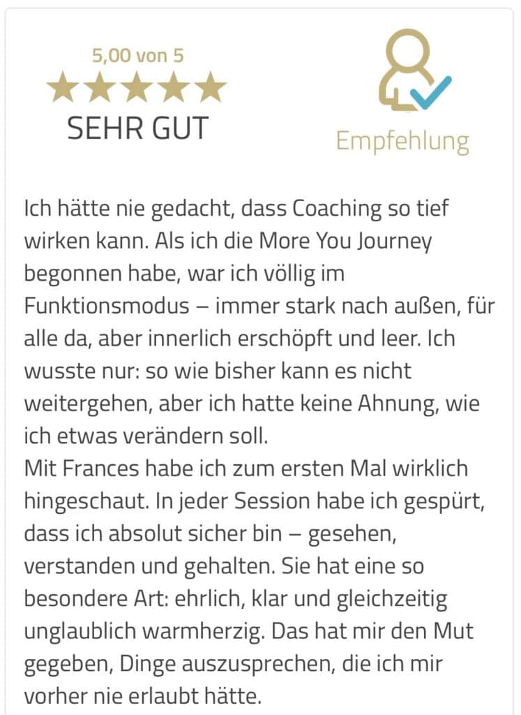 In den letzten Jahren habe ich hunderte kluge, ambitionierte und willensstarke Frauen begleitet, die – wie Du – schon viel probiert hatten und doch immer wieder an alten Mustern scheiterten. Und ich habe gesehen: Nachhaltige Veränderung ist möglich – wenn wir die wahren Ursachen anschauen und im Alltag verankern. Genau das ist meine Mission mit More You: Frauen zurück in ihre Wahrheit, Freiheit und Selbstbestimmung zu führen.
